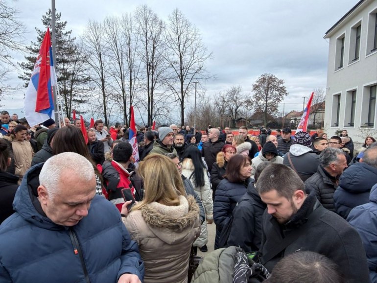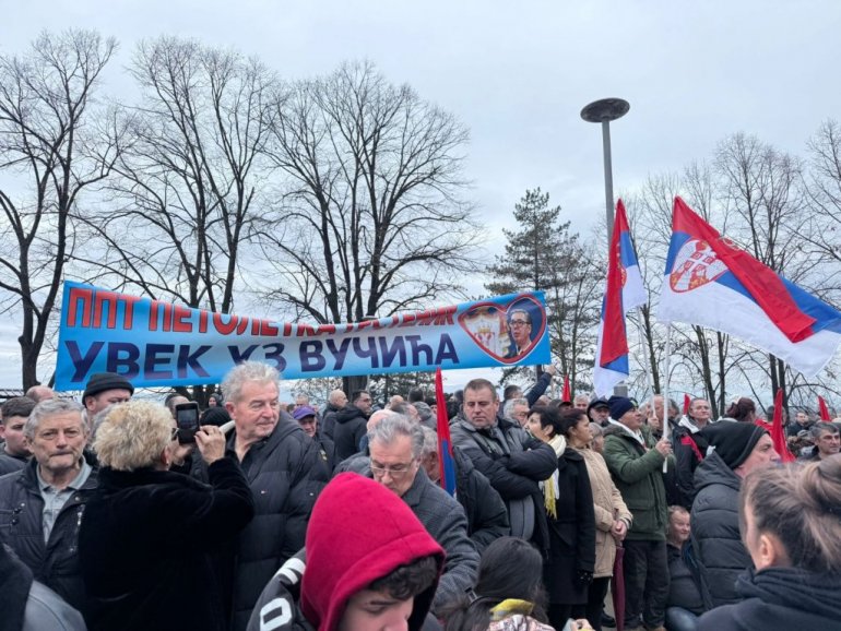 Окупљени су развили транспаренте на којима пише "увек уз Вучића", "Трстеник уз Вучића".