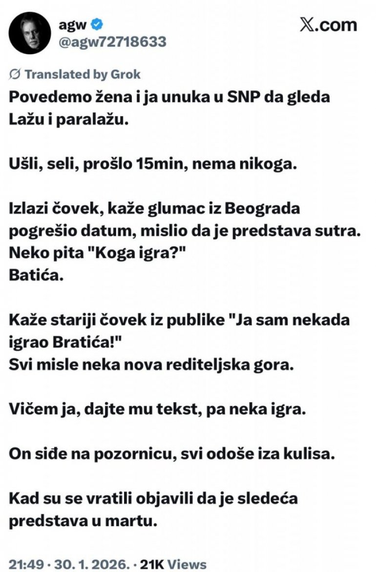 - Поведемо жена и ја унука у СНП да гледа Лажу и паралажу. Ушли, сели, прошло 15мин, нема никога. Излази човек, каже глумац из Београда погрешио датум, мислио да је представа сутра. Неко пита "Кога игра?" Батића. Каже старији човек из публике "Ја сам некада играо Братића!" Сви мисле нека нова редитељска гора. Вичем ја, дајте му текст, па нека игра. Он сиђе на позорницу, сви одоше иза кулиса. Кад су се вратили објавили да је следећа представа у марту - написао је он.