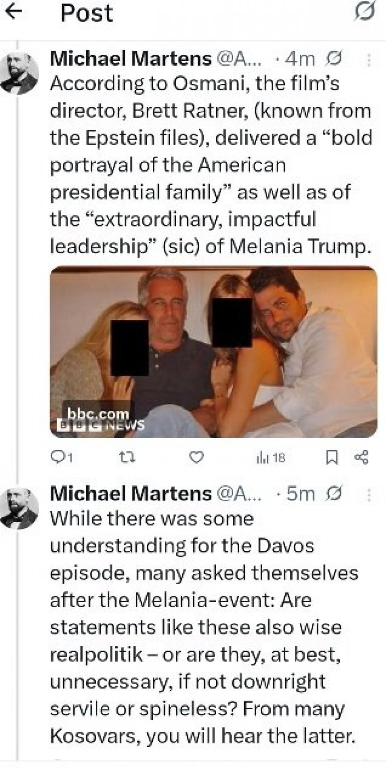 НЕМАЧКИ новинар Михаел Мартенс огласио се на друштвеној мрежи "Икс" поводом тога што Вјоса Османи велича председника САД Доналда Трампа.