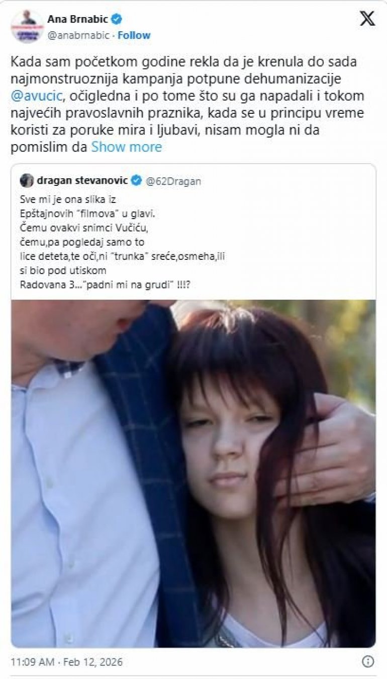 Подсетимо, председница Народне скупштине Ана Брнабић огласила се на свом налогу на мрежи Икс снажном поруком у којој је осудила, како је навела, „најмонструознију кампању потпуне дехуманизације“ против председника Србије Александра Вучића.