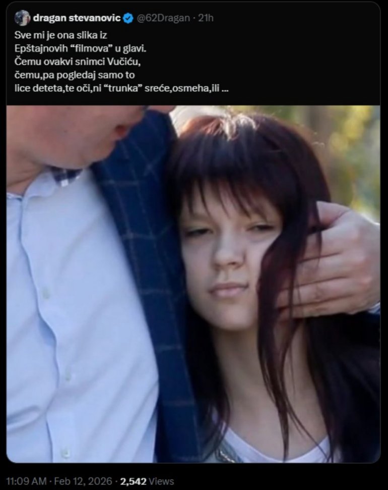 - Све ми је она слика из Епстин "филмова" у глави. Чему овакви снимци Вучићу, чему, па погледај само то лице детета, те очи, ни ’трунка’ среће, осмеха или…