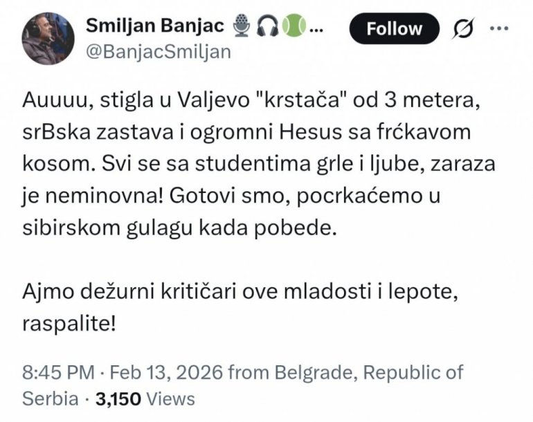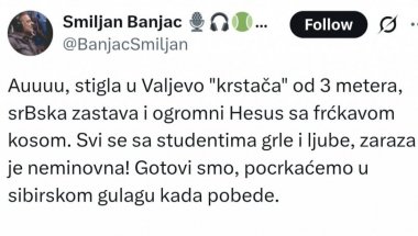 "Ауууу, стигла у Ваљево 'крстача' од 3 метра, срБска застава и огромни Хесус да фрћкавом косом. Сви се са студентима грле и љубе, зараза је неминовна! Готови смо, поцркаћемо у сибирском гулагу када победе", написао је на Иксу, преносе медији.