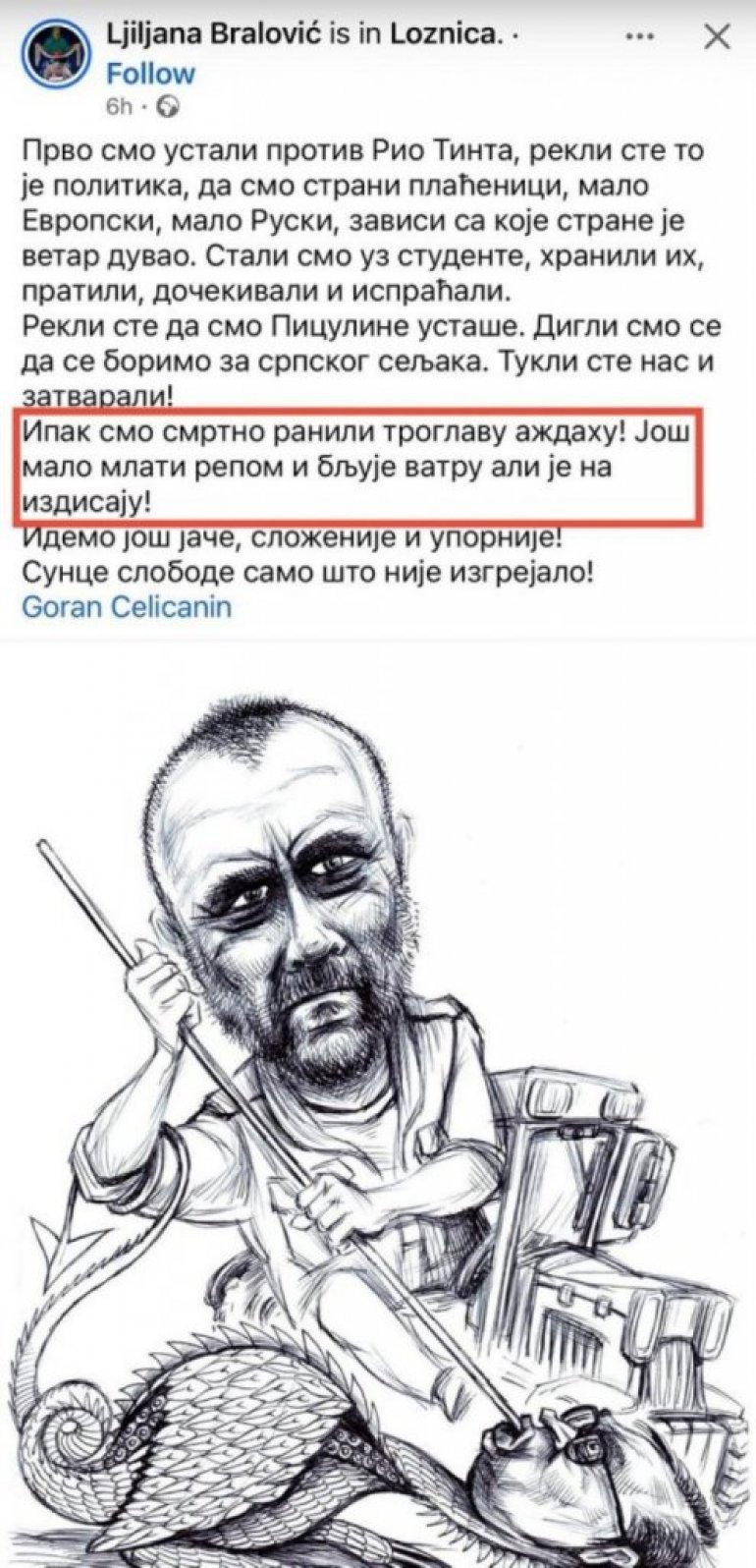 Љиљана Браловић, блокадерка са дна каце, објавила је језиву фотографију на којој Златко Кокановић, лажни еколог, копљем пробада председника Србије.
