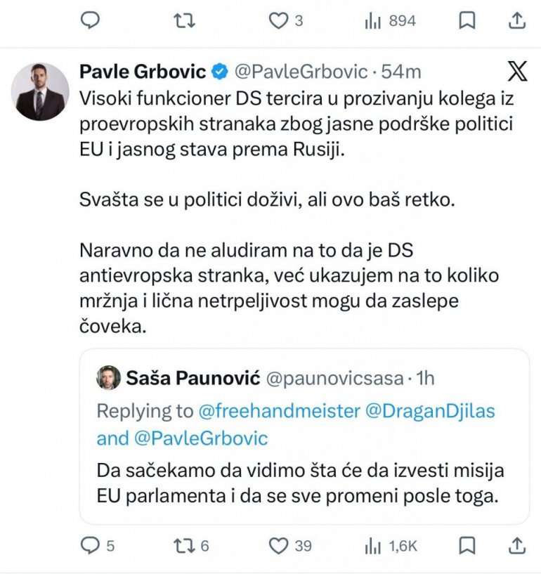 - Високи функционер ДС терцира у прозивању колега из проевропских странака због јасне подршке политици ЕУ и јасног става према Русији. Свашта се у политици доживи, али ово баш ретко. Наравно да не алудирам на то да је ДС антиевропска странка, већ указујем на то колико мржња и лична нетрпељивост могу да заслепе човека - наводи се у објави на друштвеној мрежи Икс.