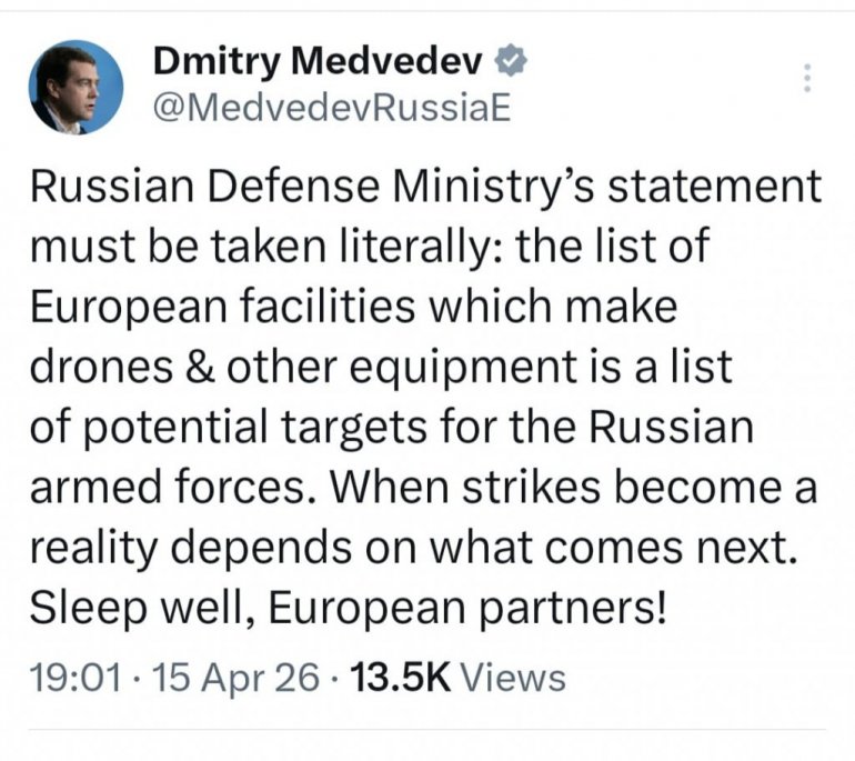 - Изјава руског Министарства одбране мора се схватити дословно: списак европских објеката који производе дронове и другу опрему представља списак потенцијалних циљева за руске оружане снаге. Када ће напади постати стварност зависи од тога шта ће се даље десити. Спавајте мирно, европски партнери! - поручио је Медведев.