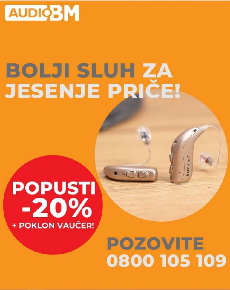 Jasni tonovi, razgovori, muzika, smeh — to su zvuci života. A pravo vreme da brinemo o svom sluhu je sada. Zato svi koji do kraja novembra pozovu besplatan broj 0800 105 109 i obave pregled sluha dobijaju poklon vaučer od 10.000 dinara za kupovinu slušnih aparata.