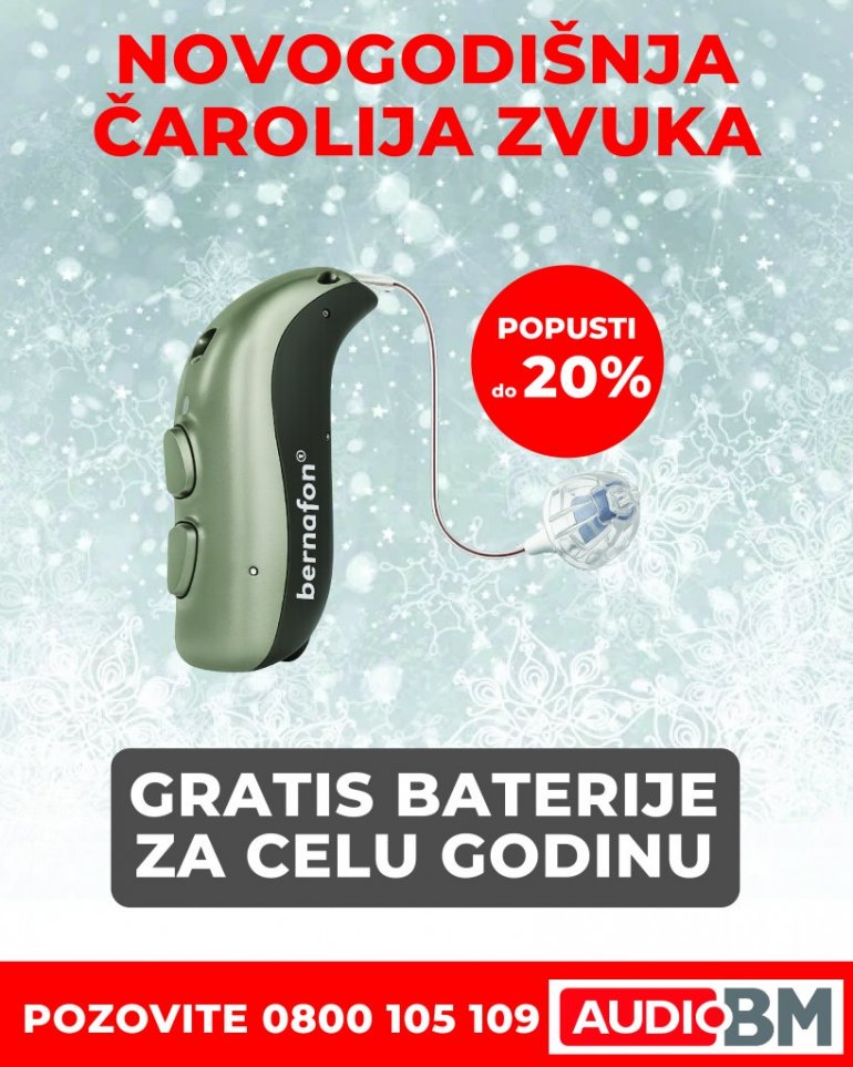 Znamo da je sluh mnogo više od tehničkog uređaja – on je veza sa ljudima, emocijama i svetom oko nas. Zato pozovite 0800 105 109 i do kraja decembra obavite proveru sluha, jer vas uz kupovinu slušnog aparata očekuje poseban poklon – baterije za celu godinu, za bezbrižno i sigurno uživanje u svakom danu koji dolazi.