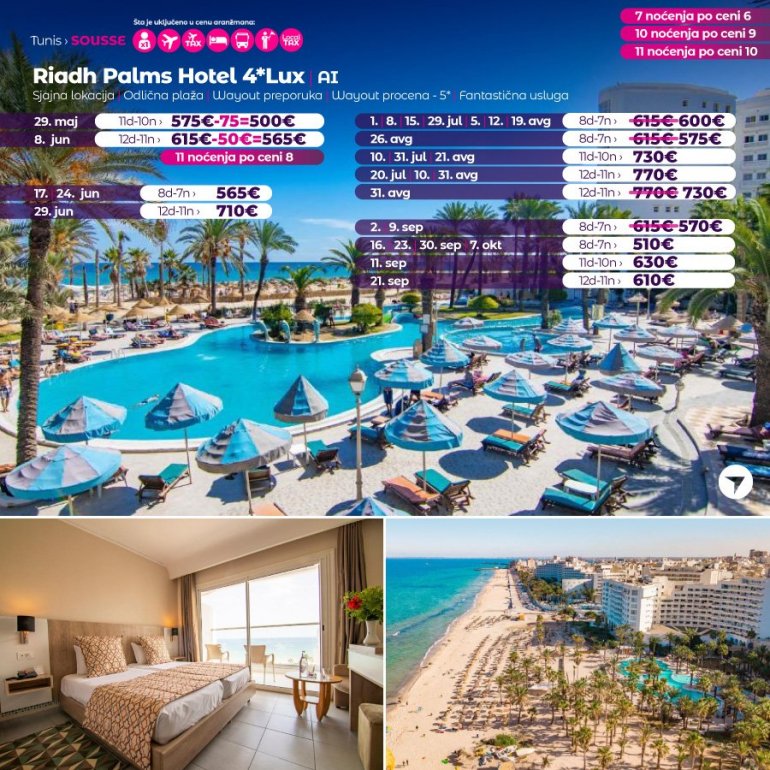 Isključivo sa AirSerbia u Tunis! 7 noćenja po ceni 6 noćenja / 10 noćenja po ceni 9 noćenja / 11 noćenja po ceni 10 noćenja. Izdvajamo iz ponude najtraženije hotele za leto 2023: