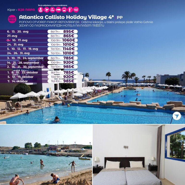 Callisto je kompleks osmišljen kao kopija tradicionalnog mediteranskog sela sa belim dvospratnim vilama plavih šalona, prozora i vrata. Vile su okružene egzotičnim drvećem i cvećem, povezane uzanim stazama sa centralnim delom hotela, u kome se nalazi restoran, recepcija, bezeni i prolaz do prelepe peščane plaže. Idealan izbor za porodice sa decom i sve ostale koji uživaju u raskošnoj prirodi, a na nekoliko minuta hoda od glavne ulice poznatog letovališta Aja Napa. Centar grada udaljen je 1,5km. Besplatan ulaz u akva park nedaleko od hotela!