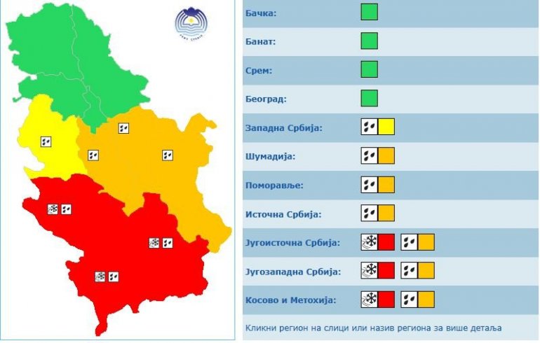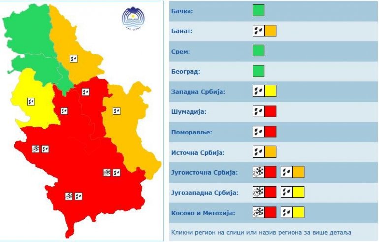 Crveni meteo-alarm, koji označava vrlo opasno vreme, na snazi je u jugoistočnoj i jugozapadnoj Srbiji i u AP Kosovo i Metohija, dok je u Šumadiji, Pomoravlju i u istočnoj Srbiji na snazi narandžasti meteo-alarm, koji označava opasno vreme.