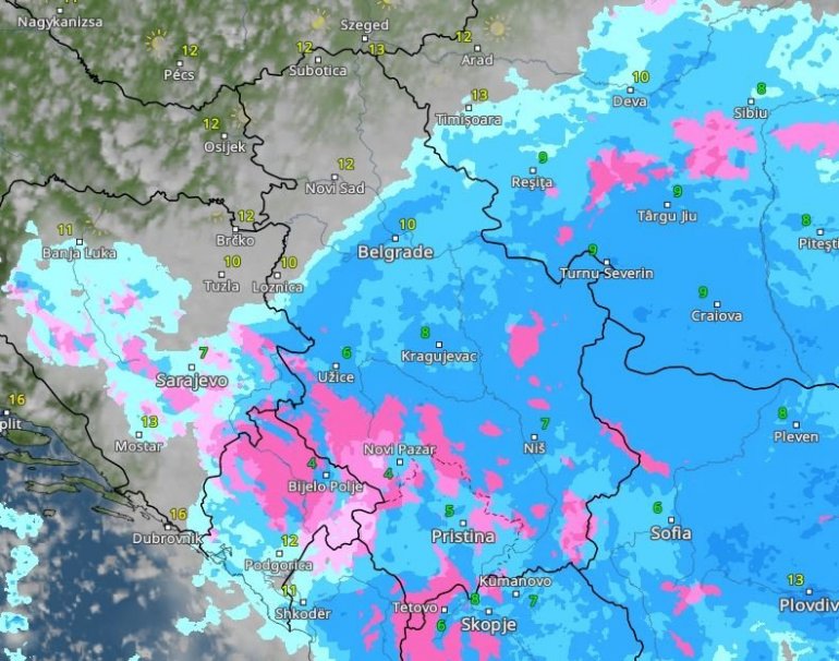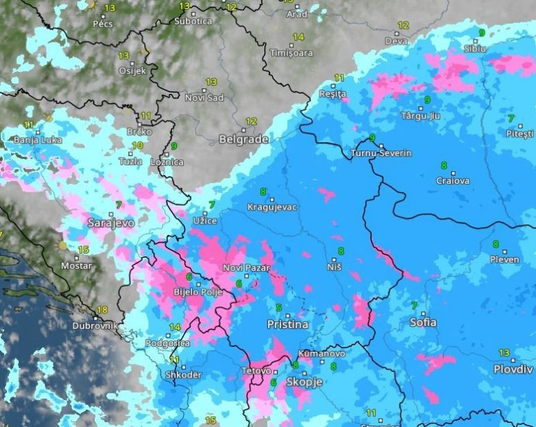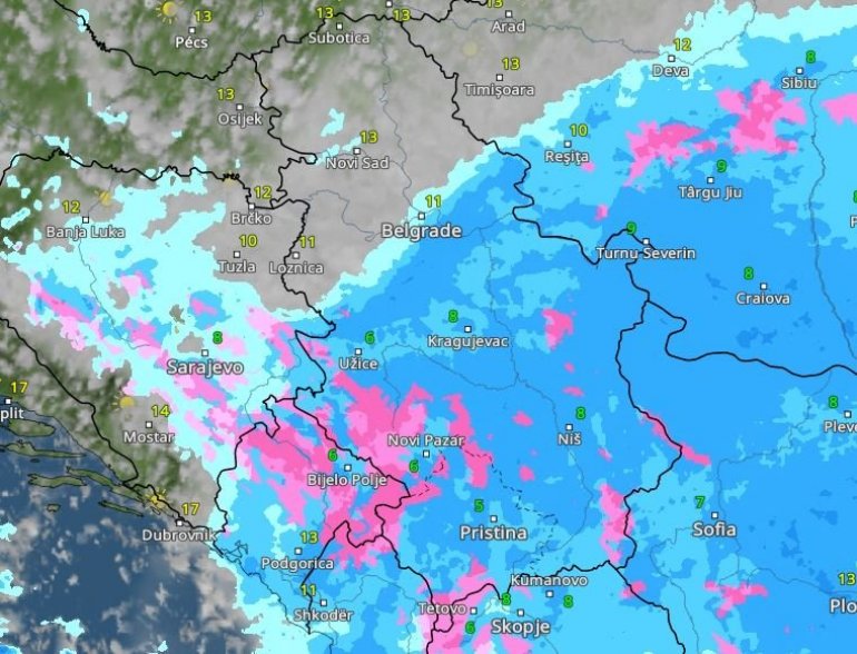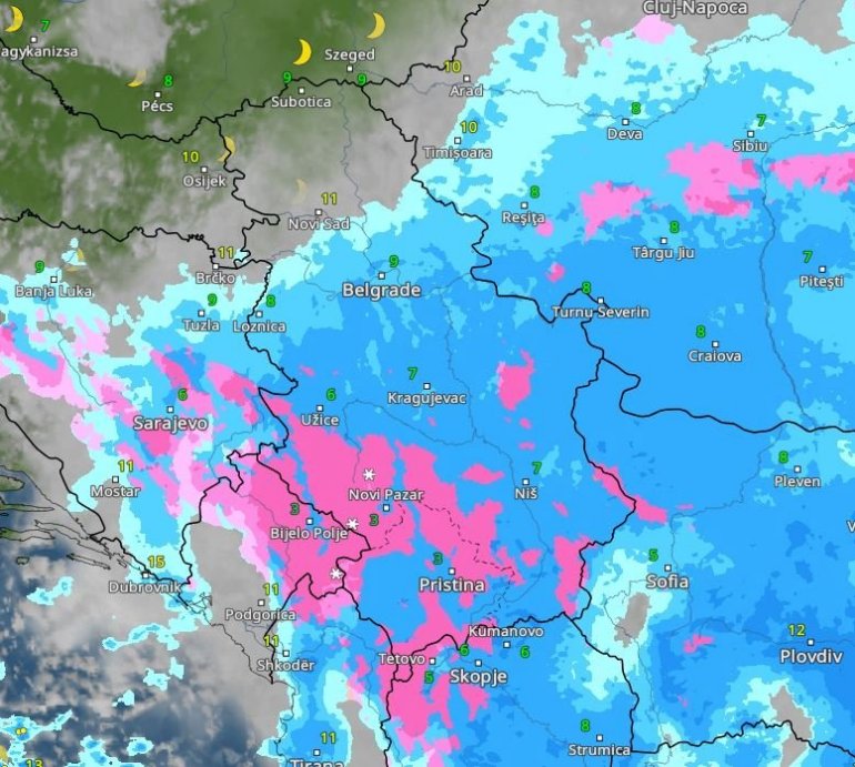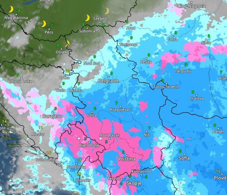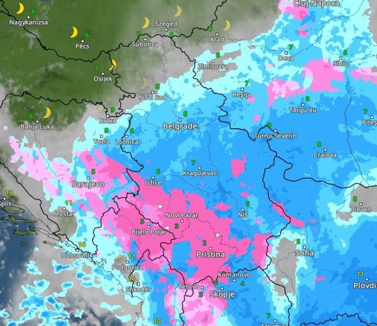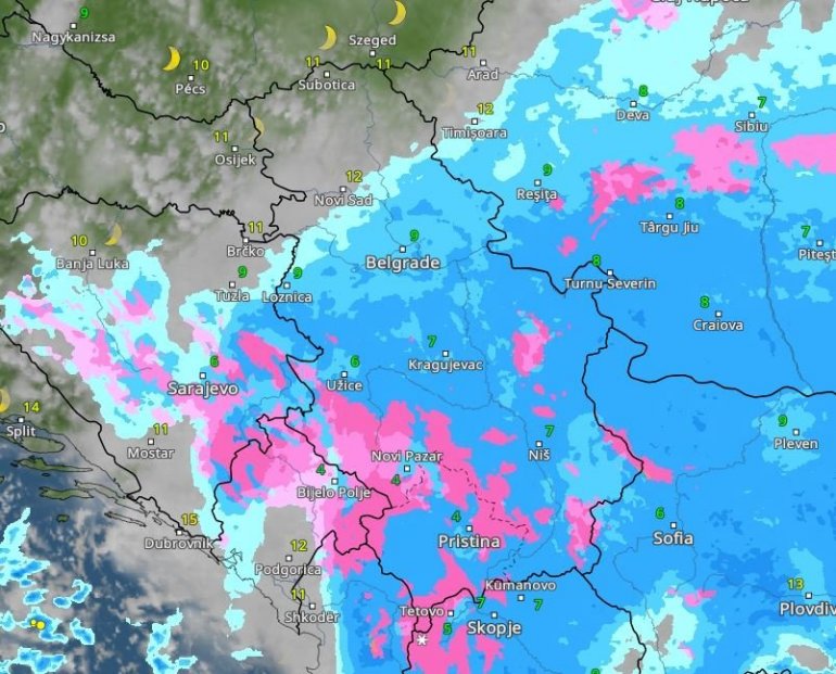 Roze bojom označen je sneg, tamnijim nijansama plave jaka kiša – i, sudeći po ovim mapama, u Beogradu možemo da je očekujemo oko 15 sati.