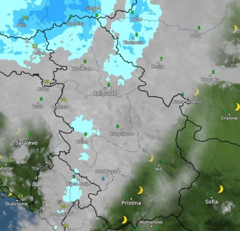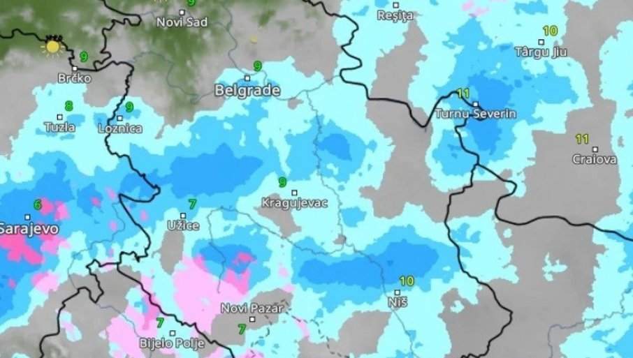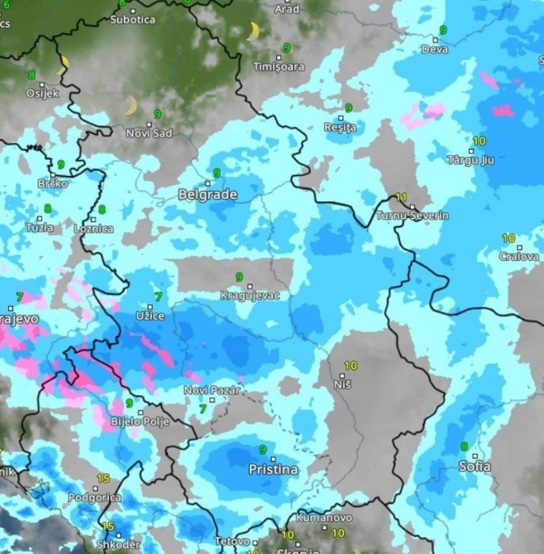 Već u ponedeljak u ranim jutarnjim satima očekuje se da kiša u zapadnim i jugozapadnim delovima zemlje pređe u sneg. Kako se vidi na radarskim snimcima, sneg će padati u okolini Nove Varoši, Prijepolja, Ivanjice, Sjenice, Kušića...