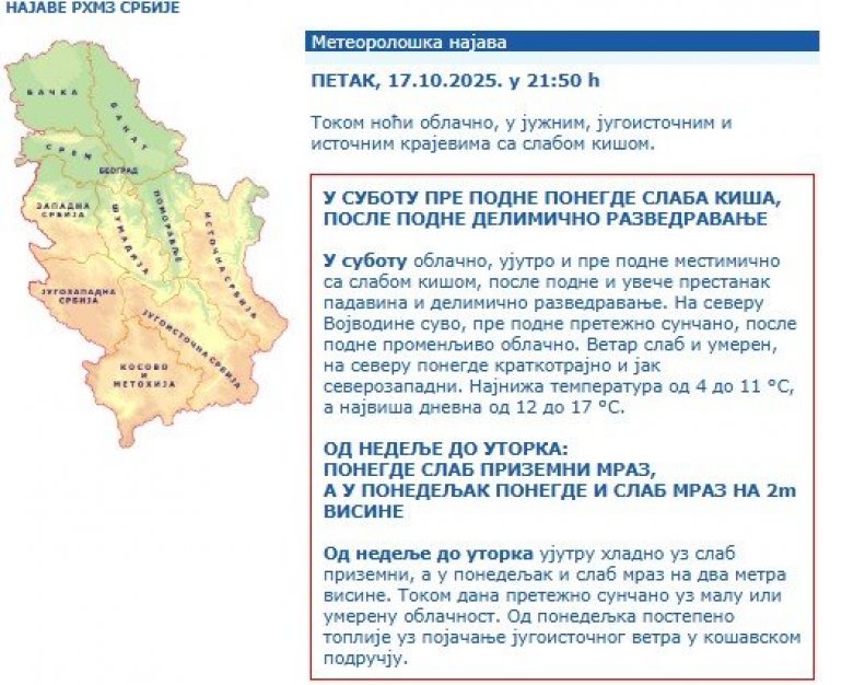 Od nedelje do utorka ujutru hladno uz slab prizemni, a u ponedeljak i slab mraz na dva metra visine. Tokom dana pretežno sunčano uz malu ili umerenu oblačnost. Od ponedeljka postepeno toplije uz pojačanje jugoistočnog vetra u košavskom području. - stoji na sajtu RHMZ.
