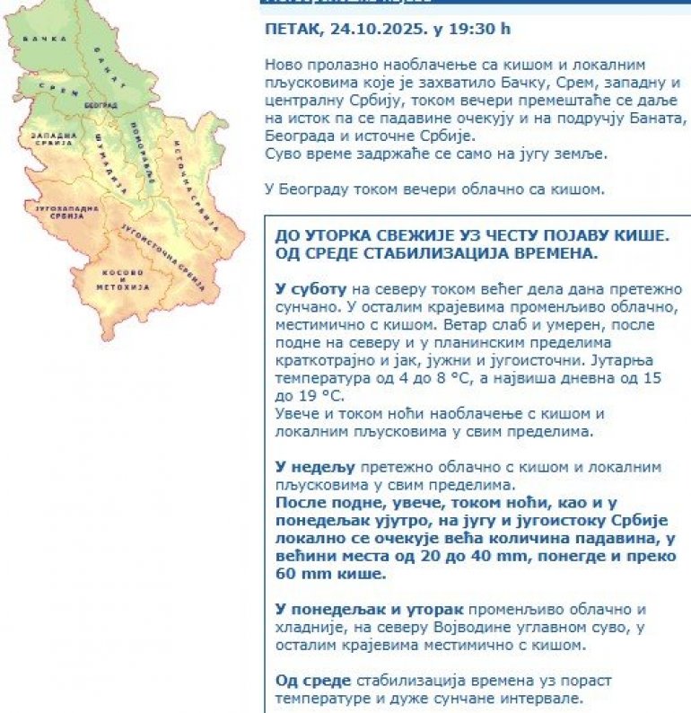 - Novo prolazno naoblačenje sa kišom i lokalnim pljuskovima koje je zahvatilo Bačku, Srem, zapadnu i centralnu Srbiju, tokom večeri premeštaće se dalje na istok pa se padavine očekuju i na području Banata, Beograda i istočne Srbije. Suvo vreme zadržaće se samo na jugu zemlje.