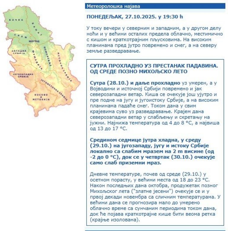 Sutra (28.10.) i dalje prohladno uz umeren, a u Vojvodini i istočnoj Srbiji povremeno i jak severozapadni vetar. Kiša se očekuje još ujutro i pre podne na jugu i jugoistoku Srbije, a na visokim planinama padaće sneg. Tokom dana u svim krajevima suvo uz razvedravanje. Krajem dana severozapadni vetar u slabljenju i skretanju na južni. Najniža temperatura od 4 do 8 °S, a najviša od 13 do 17 °S.