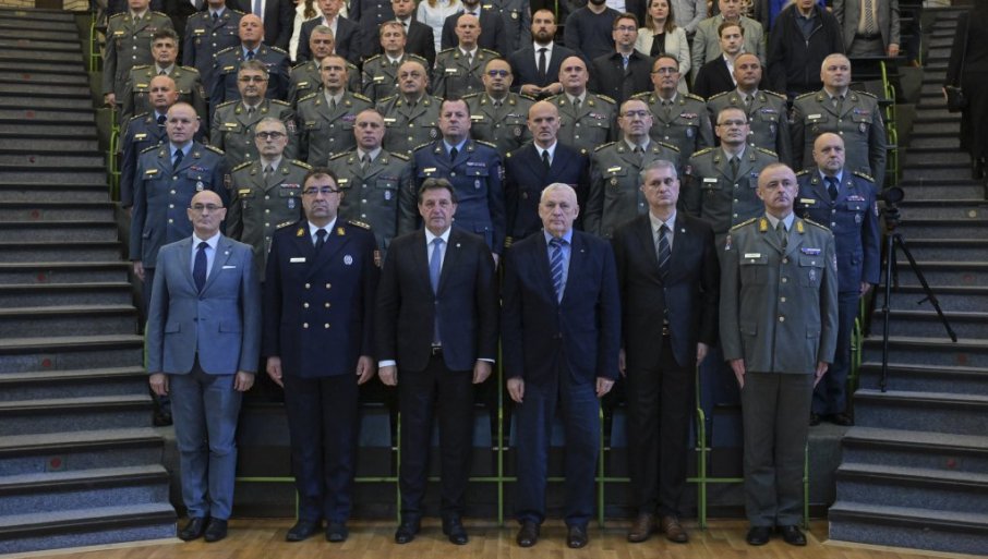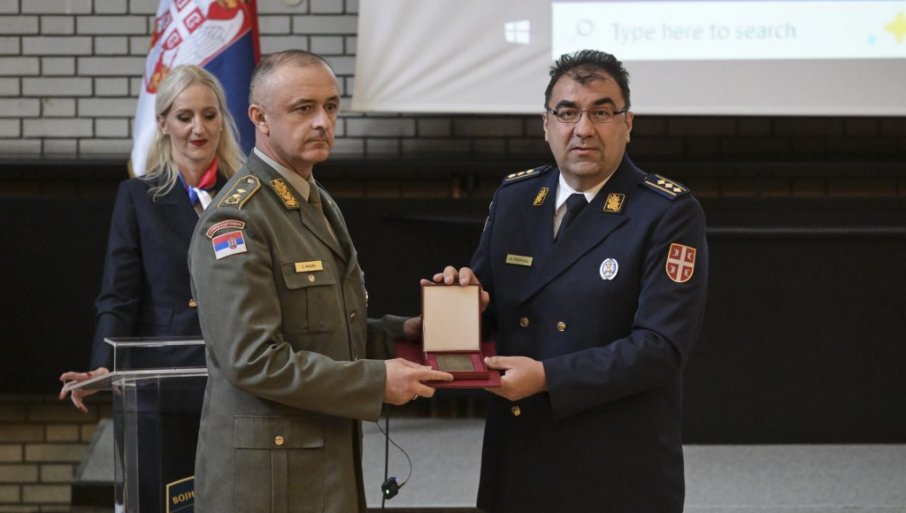 Direktor instituta pukovnik dr Ivan Pokrajac povodom obeležavanja 77 godina rada te ustanove uručio je Veliku plaketu Vojnotehničkog instituta ministru odbrane Bratislavu Gašiću.