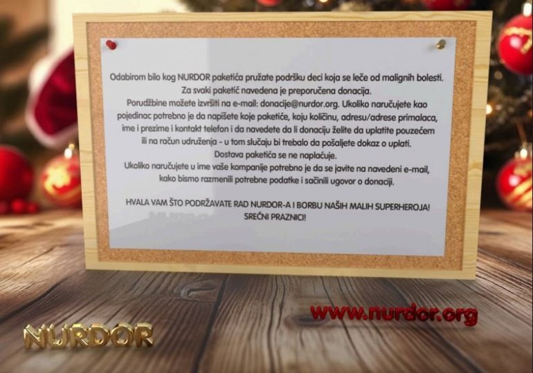 Svi građani i kompanije koji žele da podrže kampanju mogu to učiniti odabirom prazničnih poklona iz NURDOR novogodišnjeg kataloga za svoje prijatelje i poslovne saradnike. Svaki poklon postaje deo velike humanitarne priče koja pomaže deci oboleloj od raka i njihovim porodicama da dobiju ono što im je najpotrebnije: podršku, sigurnost i osećaj da nisu sami.