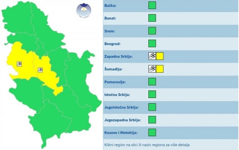 Sutra će žuti meteoalarm biti na snazi samo na području Zapadne Srbije i Šumadije.