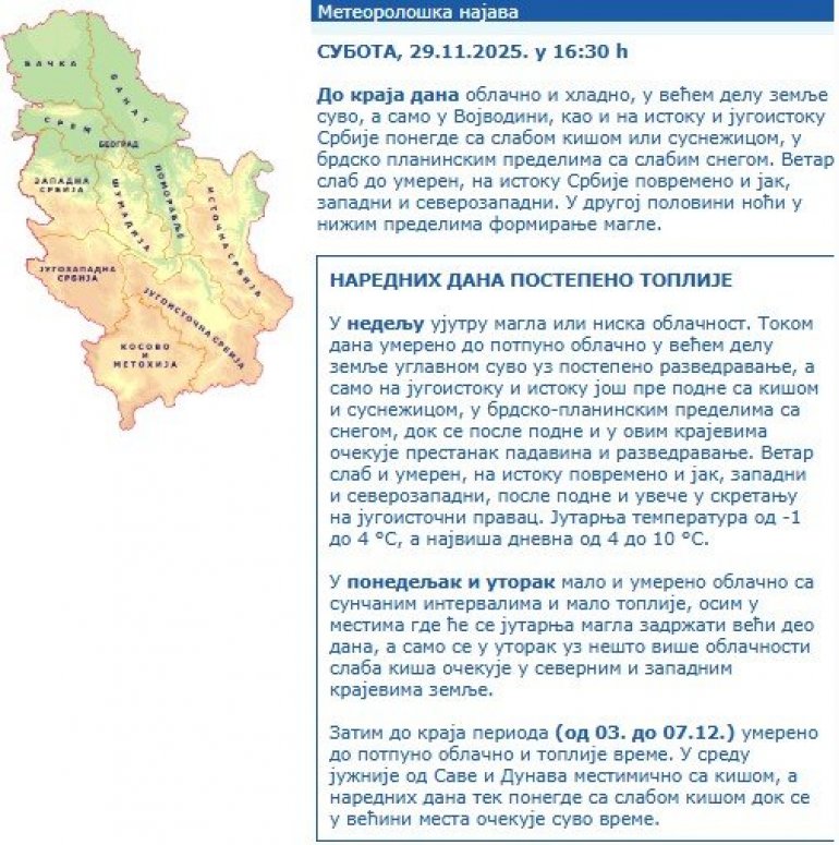 - Do kraja dana oblačno i hladno, u većem delu zemlje suvo, a samo u Vojvodini, kao i na istoku i jugoistoku Srbije ponegde sa slabom kišom ili susnežicom, u brdsko planinskim predelima sa slabim snegom. Vetar slab do umeren, na istoku Srbije povremeno i jak, zapadni i severozapadni. U drugoj polovini noći u nižim predelima formiranje magle.