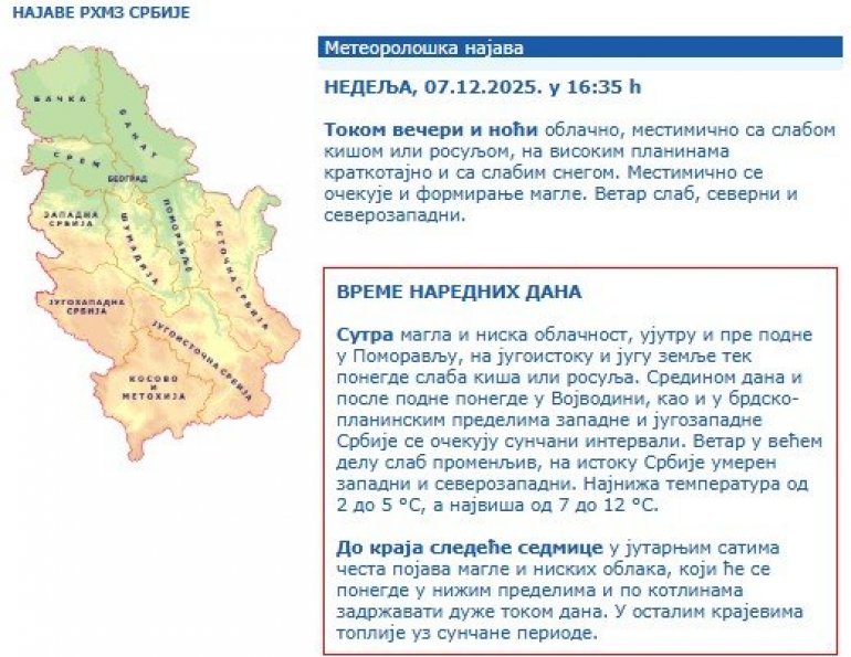 Sutra magla i niska oblačnost, ujutru i pre podne u Pomoravlju, na jugoistoku i jugu zemlje tek ponegde slaba kiša ili rosulja. Sredinom dana i posle podne ponegde u Vojvodini, kao i u brdsko-planinskim predelima zapadne i jugozapadne Srbije se očekuju sunčani intervali. Vetar u većem delu slab promenljiv, na istoku Srbije umeren zapadni i severozapadni. Najniža temperatura od 2 do 5 °S, a najviša od 7 do 12 °S.