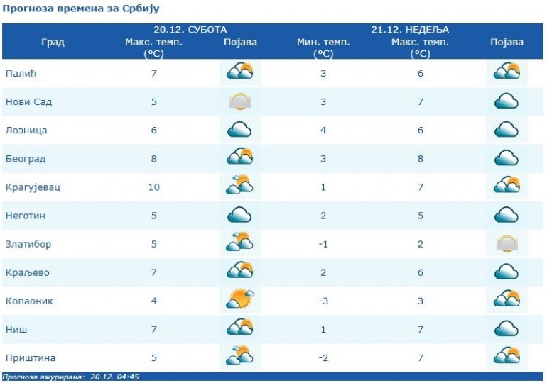 U nedelju i ponedeljak u većem delu oblačno i maglovito, na istoku Srbije ponegde sa sipećom kišom, dok se periodi sunčanog vremena očekuju samo na visokim planinama južne Srbije.