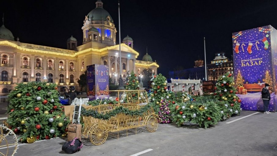 NA PLATOU ispred Narodne skupštine Srbije postavljeni su štandovi sa oznakom "Novogodišnji bazar“, dok se istovremeno dopremaju ukrašene jelke, sve sa ciljem da bude otvoreno za građane kao novogodišnja i božićna atrakcija.