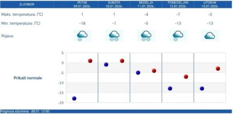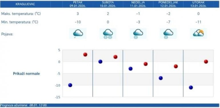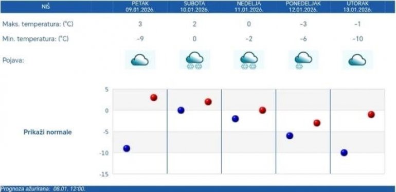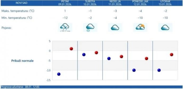 U vremenskoj prognozi za petak, RHMZ je najavio da će ujutru biti malo do umereno oblačno i veoma hladno sa jakim mrazem, srećom, tokom dana biće malo toplije.