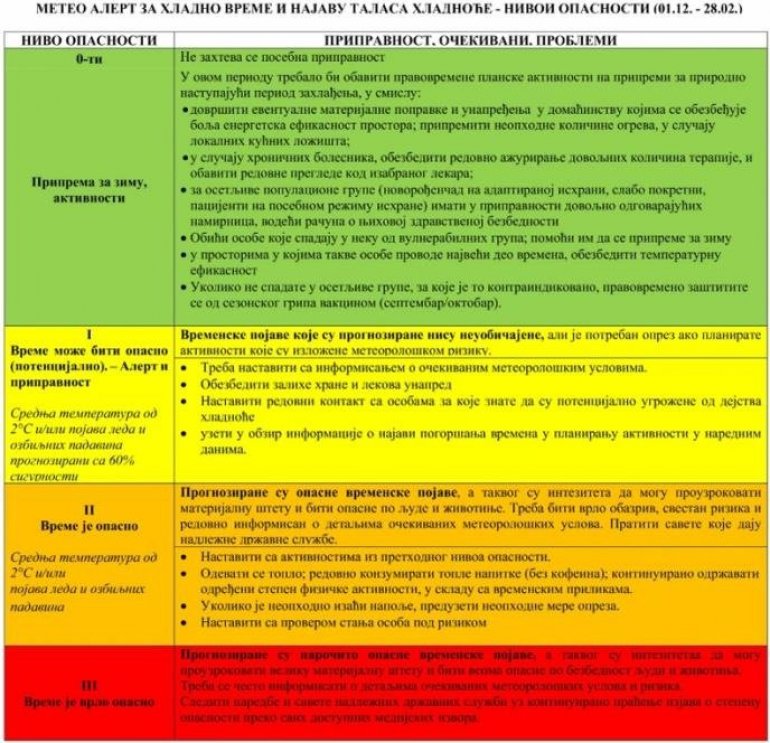 Povodom ekstremno hladnog vremena koje je potencijalno opasno po zdravlje “Batut” je objavio da su najkritičniji dani četvrtak i naročito petak , za kada je zbog ekstremnih pojava u većini mesta u Srbiji upaljen “narandžasti”, pretposlednji nivo upozorenja, a u Južnobačkom okrugu i “crveni”, najviši nivo upozorenja i temperatura od čak -16 stepeni Celzijusovih!