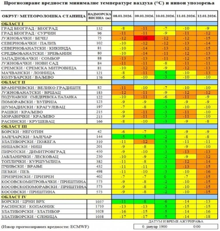 U domenu opasne pojave biće minimalne dnevne temperature vazduha u periodu od 8. do 12. januara na severu i delu istočne i centralne Srbije, a 11. i 12. januara u većem delu zemlje.
