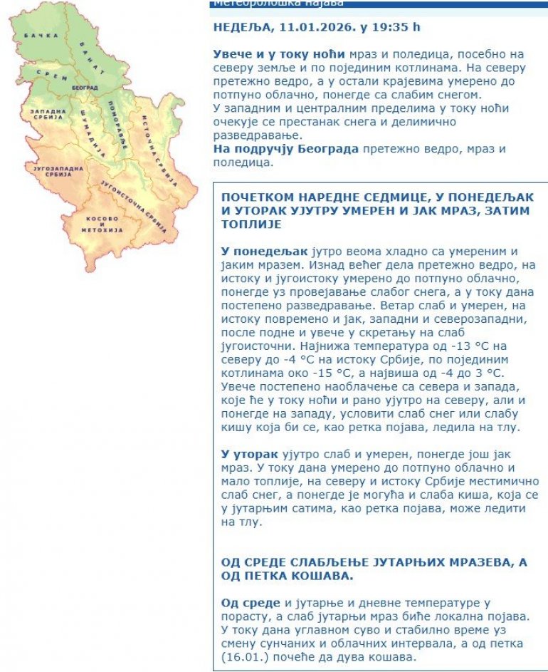- Uveče i u toku noći mraz i poledica, posebno na severu zemlje i po pojedinim kotlinama. Na severu pretežno vedro, a u ostali krajevima umereno do potpuno oblačno, ponegde sa slabim snegom.