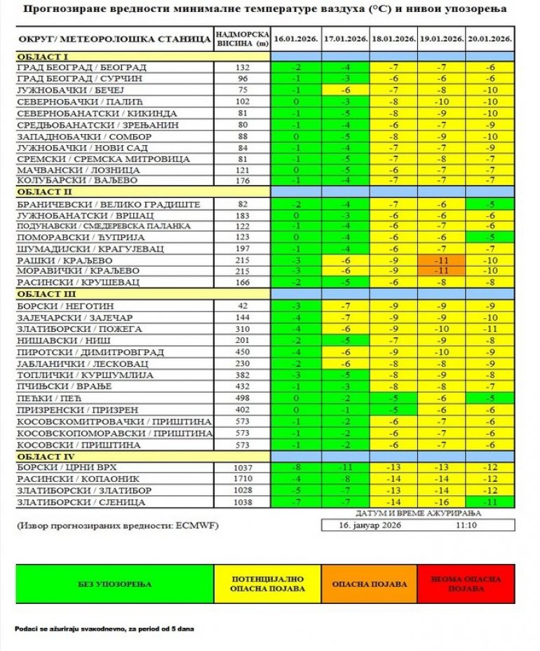 Prema njihovoj najavi, prognozirane vrednosti minimalne dnevne temperature vazduha biće u kategoriji opasne pojave 18. i 19. januara u Raškom i Moravičkom okrugu, kao i 19. januara u Zlatiborskom okrugu, a u kategoriji potencijalno opasne pojave 17. januara u Raškom, Moravičkom, Borskom, Zaječarskom i Zlatiborskom okrugu, a 18. i 19. januara u većem delu Srbije.