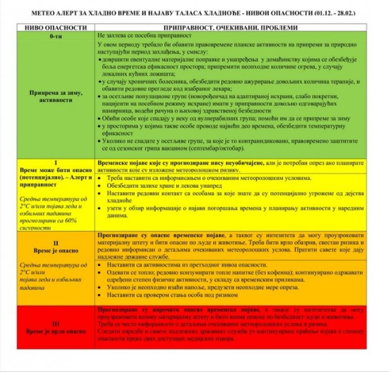 - Prognozirane vrednosti minimalne dnevne temperature vazduha biće u kategoriji veoma opasne pojave 24. januara u Severnobačkom okrugu, dok će u kategoriji opasne pojave one biti od 18. do 21. januara u Rraškom i Moravičkom okrugu, a od 20. do 22. januara u Zapadnobačkom okrugu, kao i od 21. do 24. januara u Severnobačkom okrugu, a 20. januara u Zlatiborskom okrugu, a 21. i 24. januara u Južnobačkom okrugu, dok će u kategoriji potencijalno opasne one biti od 18. do 24. januara na severu zemllje, kao i u delovima zapadne i centralne Srbije, a od 18. do 22. januara u većem delu zemlje.