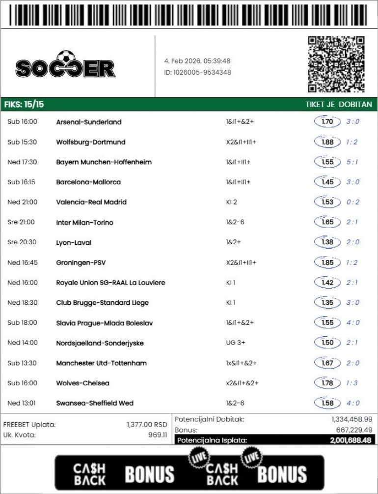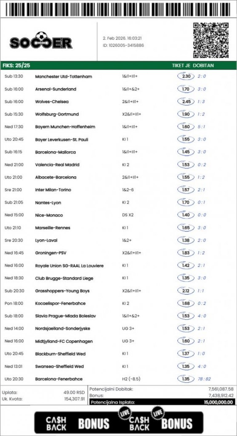Ovo nije tipičan dobitak. Ovo je demonstracija onoga što je moguće kada se spoje znanje, osećaj i uslovi koje nudi SOCCERBET. freebet ili sopstveni novac - razlika ne postoji kada tiket ne greši.