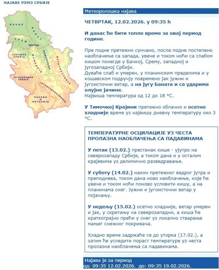 U nedelju (15. februara) očekuje se osetno hladnije vreme, uz umeren i jak vetar, u skretanju na severozapadni, a kiša će kratkotrajno preći u sneg uz lokalno stvaranje manjeg snežnog pokrivača.