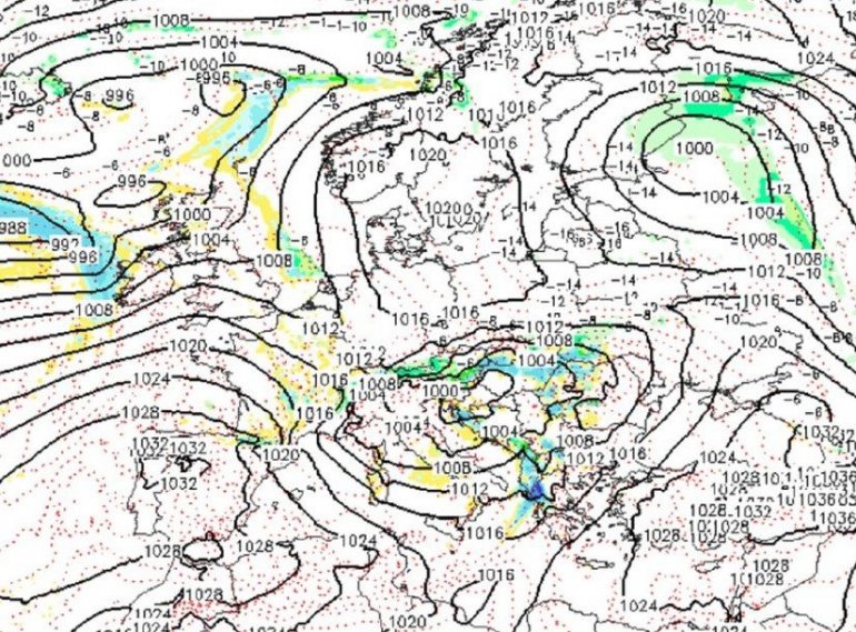 U ovom času sve više jača ciklon iznad Đenovskog zaliva. On prema nama šalje veoma izražena južna strujanja i veoma toplu vazdušnu masu sa Mediterana.