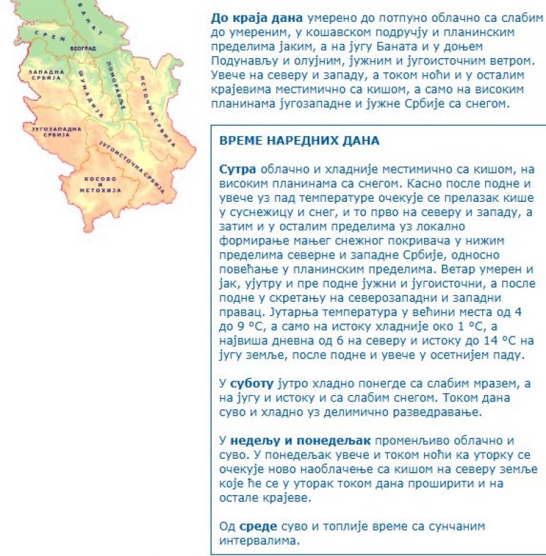 Sutra oblačno i hladnije mestimično sa kišom, na visokim planinama sa snegom. Kasno posle podne i uveče uz pad temperature očekuje se prelazak kiše u susnežicu i sneg, i to prvo na severu i zapadu, a zatim i u ostalim predelima uz lokalno formiranje manjeg snežnog pokrivača u nižim predelima severne i zapadne Srbije, odnosno povećanje u planinskim predelima. Vetar umeren i jak, ujutru i pre podne južni i jugoistočni, a posle podne u skretanju na severozapadni i zapadni pravac. Jutarnja temperatura u većini mesta od 4 do 9 °S, a samo na istoku hladnije oko 1 °S, a najviša dnevna od 6 na severu i istoku do 14 °S na jugu zemlje, posle podne i uveče u osetnijem padu.