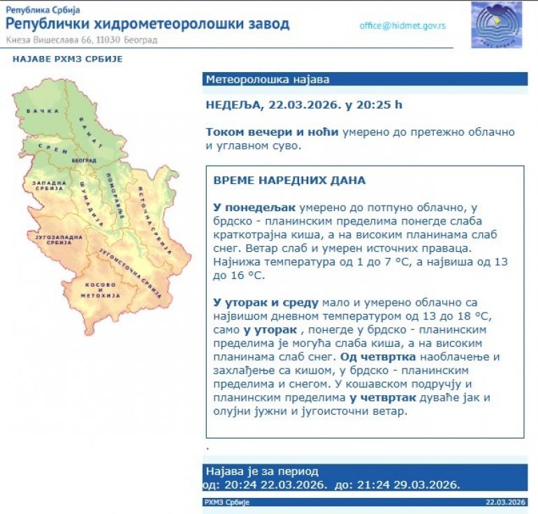 STIŽE OZBILJNO ZAHLAĐANJE SA PADAVINAMA: Prognoza RHMZ-a za narednu sedmicu