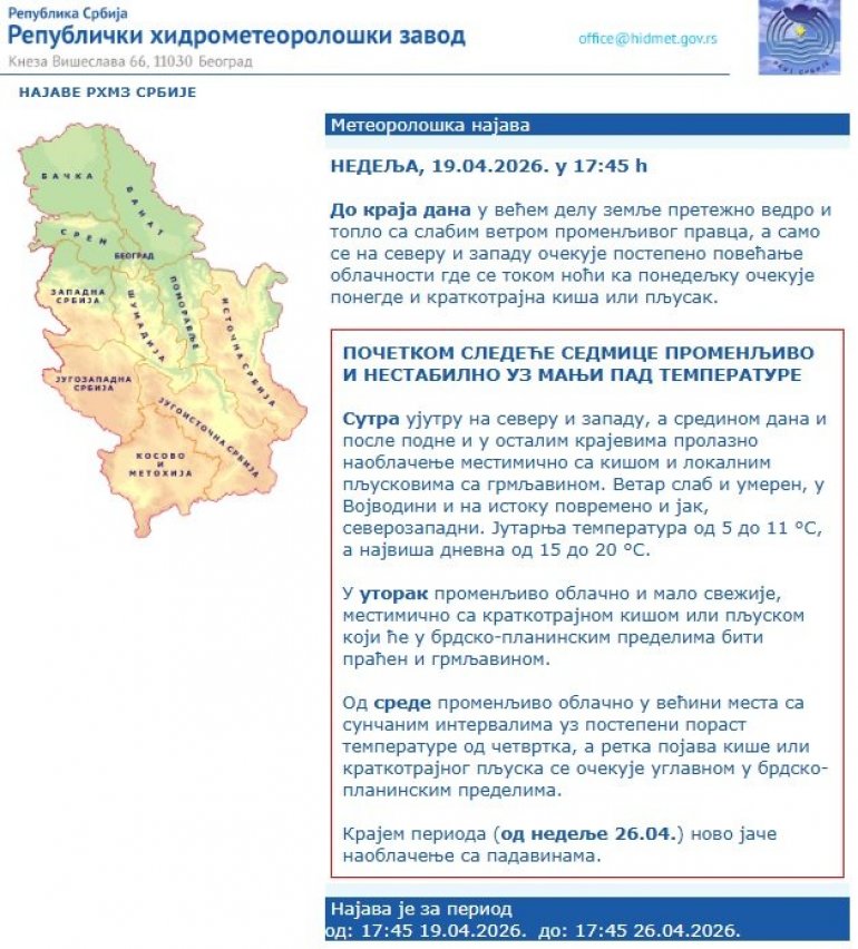 Sutra ujutru na severu i zapadu, a sredinom dana i posle podne i u ostalim krajevima prolazno naoblačenje mestimično sa kišom i lokalnim pljuskovima sa grmljavinom. Vetar slab i umeren, u Vojvodini i na istoku povremeno i jak, severozapadni. Jutarnja temperatura od 5 do 11 °S, a najviša dnevna od 15 do 20 °S.