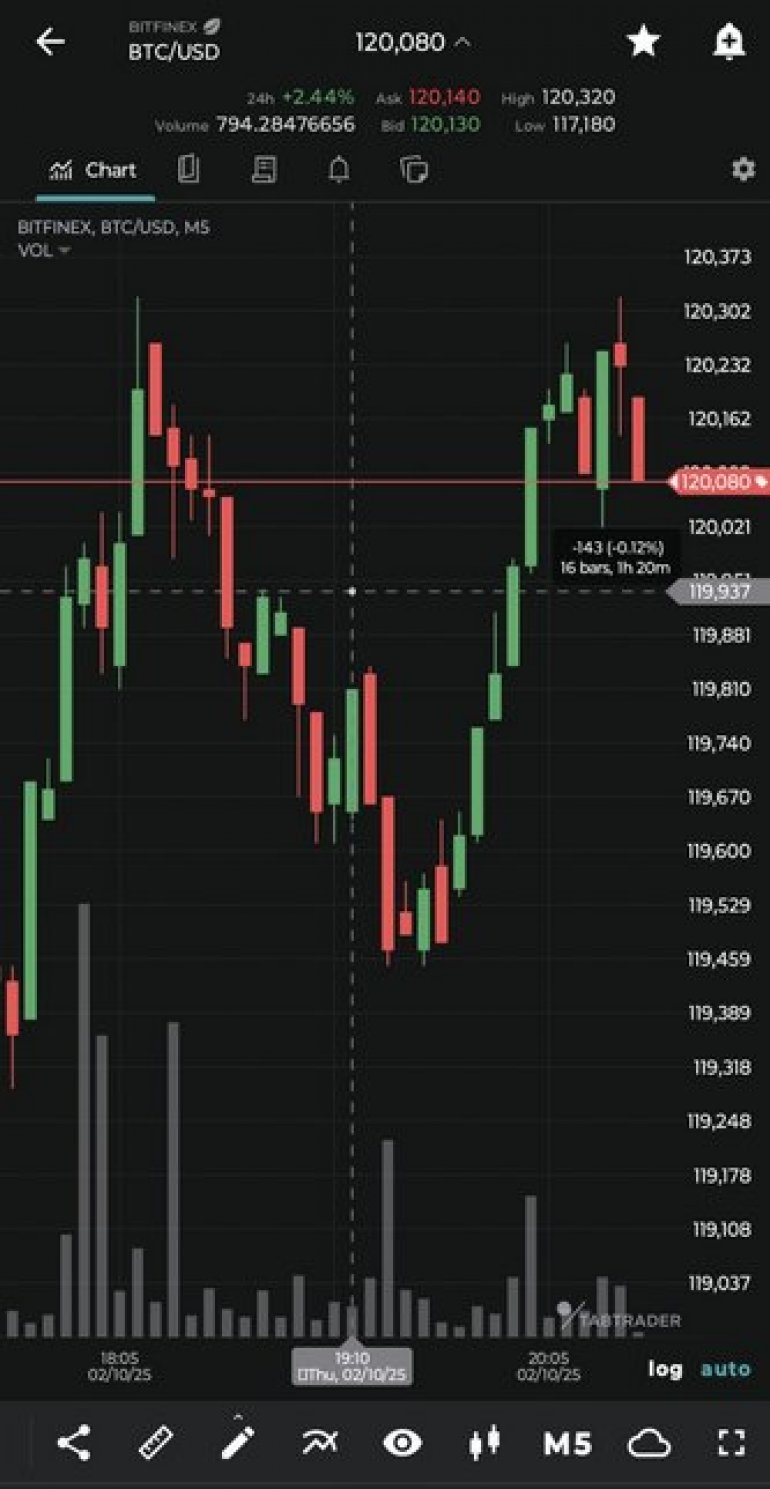 NA POPULARNOJ berzi Bitfinex, u poslednjih nekoliko sati viđena je žestoka borba, cene su se u kratkom roku podigle za više od 1.2%, a BTC se trenutno trguje na $120,080.
