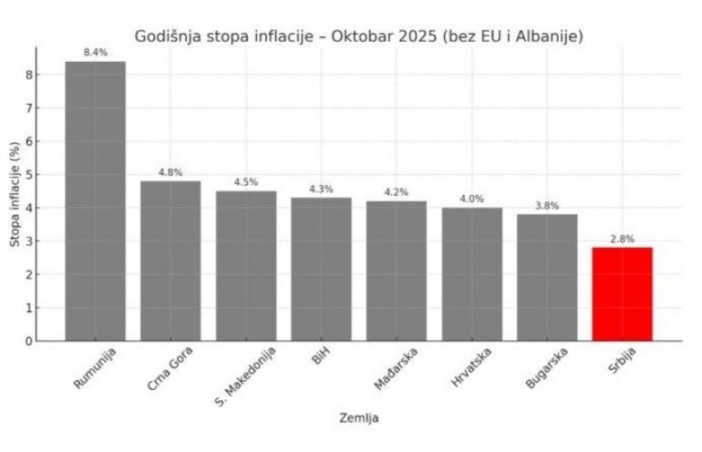 Sa inflacijom od svega 2,8%, nalazi se ispod većine susednih država, kao što su Bugarska (3,8%), Hrvatska (4,0%), Mađarska (4,2%) i Crna Gora (4,8%). Najvišu inflaciju beleži Rumunija, koja dostiže čak 8,4%, dok se većina zemalja regiona kreće iznad nivoa od 4%.
