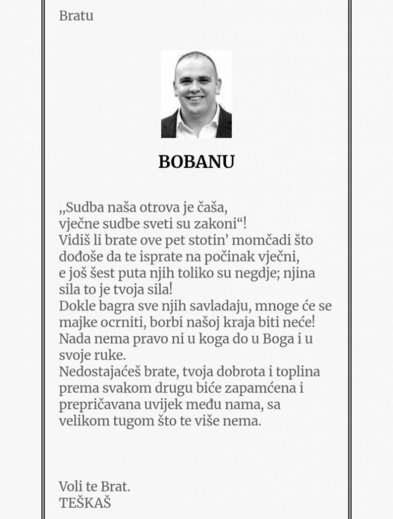 Nedostajaćeš brate, tvoja dobrota i toplina prema svakom drugu biće zapamćena i prepričavana uvek među nama, sa velikom tugom što te više nema. Voli te brat, Teškaš - piše u misterioznoj čitulji koja je osvanula u jednim crnogorskim novinama.