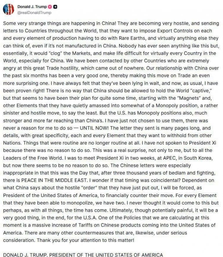 Prema njegovim rečima, Kina pokušava da nametne kontrolu izvoza retkih zemnih metala i drugih ključnih materijala, za koje Tramp tvrdi da narušava globalna tržišta.