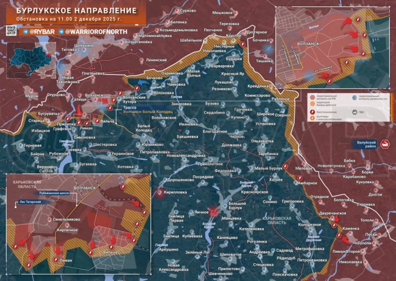 Prema istim izvorima, ruske snage su u Harkovskoj oblasti ostvarile ozbiljne pomake. Nakon zauzimanja Volčanska nastavljeno je potiskivanje ukrajinskih jedinica prema selu Viljča, gde je prema lokalnim izveštajima otpor protivničkih snaga u povlačenju slomljen prodorom ruskih boraca kroz šumska područja. Objavljeni snimci potvrđuju da je sistem Tornado-S precizno pogodio privremenu tačku raspoređivanja ukrajinskih snaga, pri čemu od mete gotovo ništa nije ostalo.