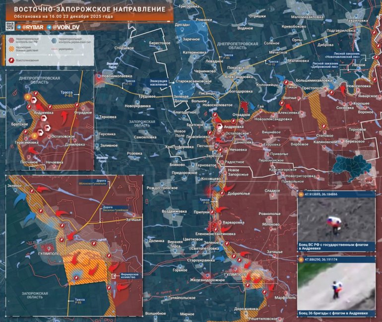 Prema izveštajima sa terena, grupa „Istok“ je zauzela selo Andrejevka i značajno povećala pritisak na Bratskoje. Istovremeno, beleže se uspesi i u pravcu Ternovatoje, na zapadnoj obali reke Gajčur. Uspostavljanje čvrstog mostobrana u ovom području otvorilo bi ruskim snagama mogućnost za šire operacije i potencijalno oslobađanje većeg dela Zaporoške oblasti tokom zimske kampanje.
