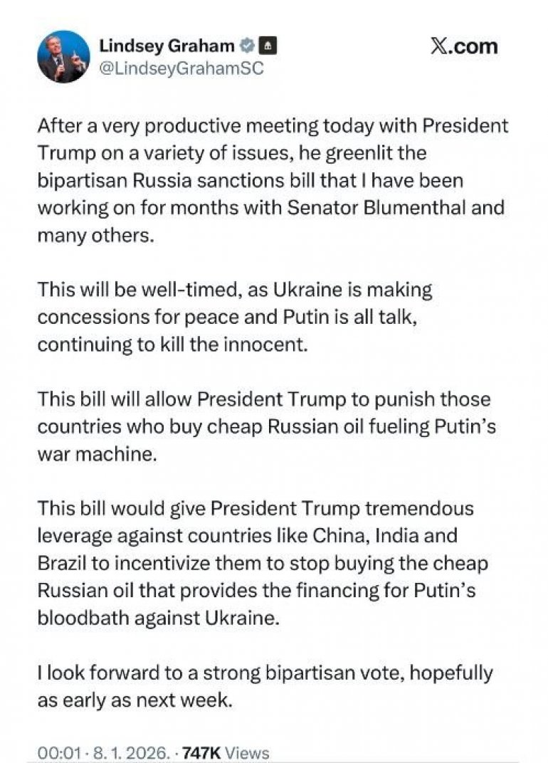 - Ovaj zakon bi predsedniku Trampu dao veliku polugu protiv zemalja poput Kine, Indije i Brazila kako bi ih primorao da prekinu sa kupovinom jeftine ruske nafte, kojom se finansira Putinovo krvoproliće protiv Ukrajine. Radujem se snažnoj podršci obe stranke tokom glasanja, nadam se početkom sledeće nedelje - naveo je u objavi na mrežama.