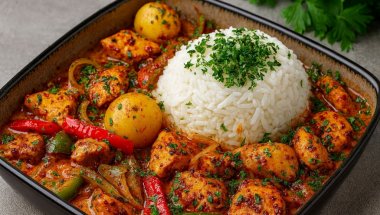 Dodatno začinite po ukusu. Služite toplo uz pirinač sa začinskim biljem i pospite svežim peršunom.