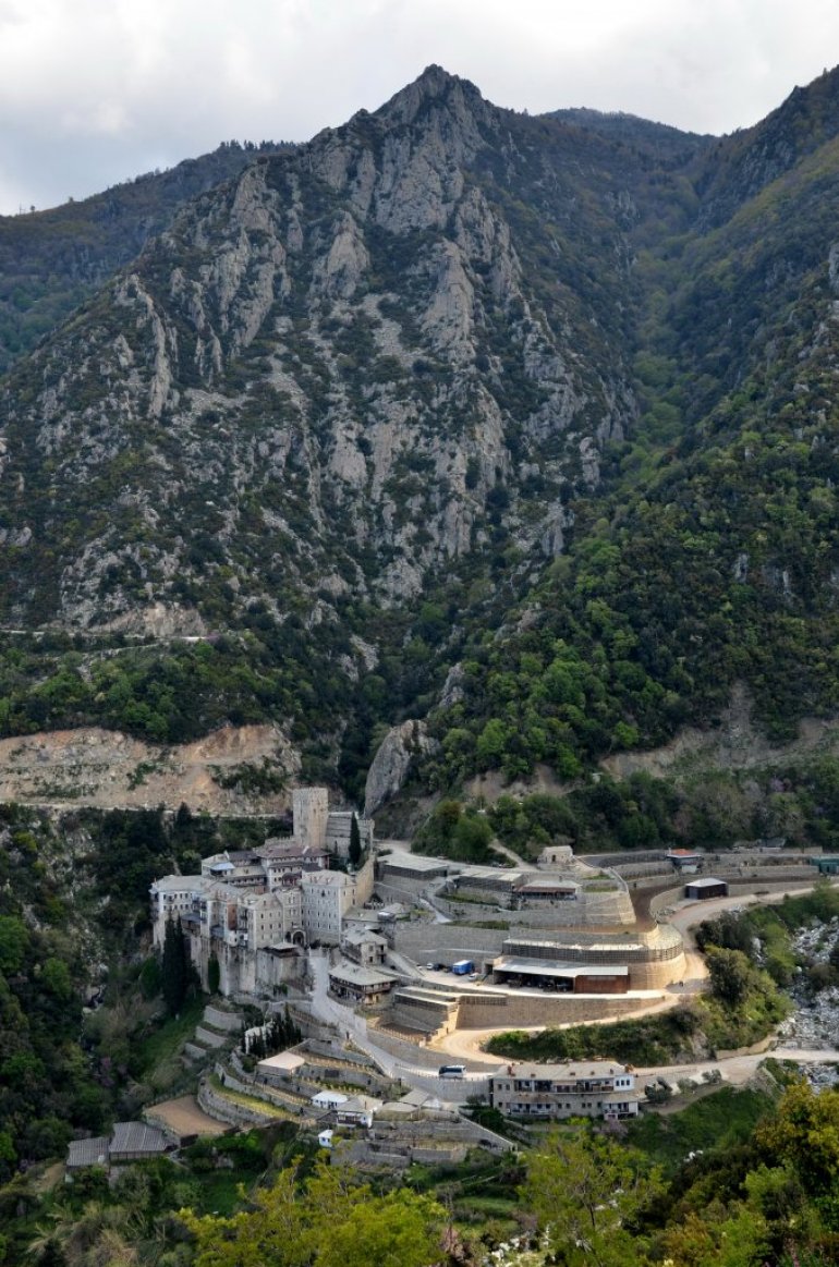HODAJUĆI uskom stazom po litici zapadne obale Svete Gore ka njenom najkrševitijem i najvišem delu stiže se u duboko grotlo uvale između vrha Aton i njemu suprotstavljenog i nešto nižeg Antiatona. Pred očima putnika koji stigne u zoru ukazuje se dramatičan prizor sunčevih zraka koji probijaju ljubičaste oblake i osvetljavaju manastir Svetog Pavla u ždrelu klisure između dva planinska vrha.