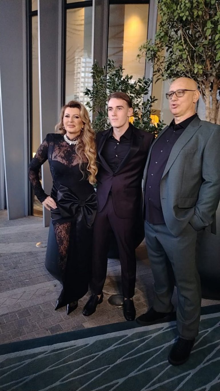 Viki blista u elegantnoj toaleti, a paru osmeh, koji pokazuje koliko su ponosni na svog sina, ne silazi sa lica.