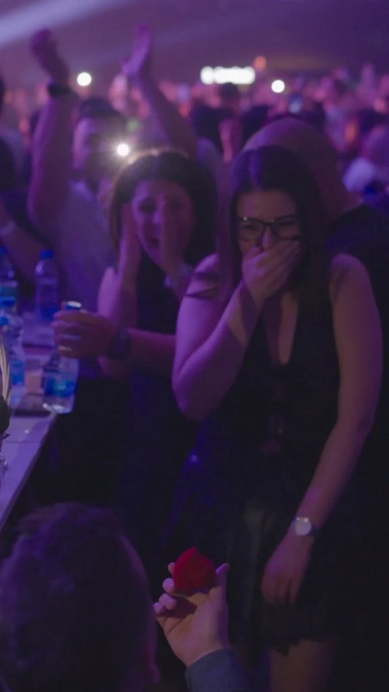 Dok se na velikom ekranu i oko njih odvijala se čarolija, on je kleknuo pred svoju devojku, koja je briznula u suze od iznenađenja i sreće, a emotivan čin je pozdravljen je aplauzom svih prisutnih.