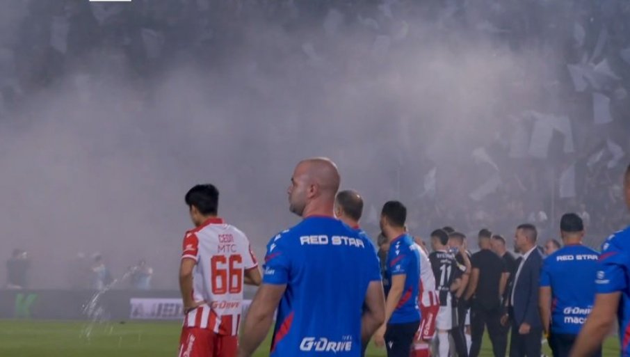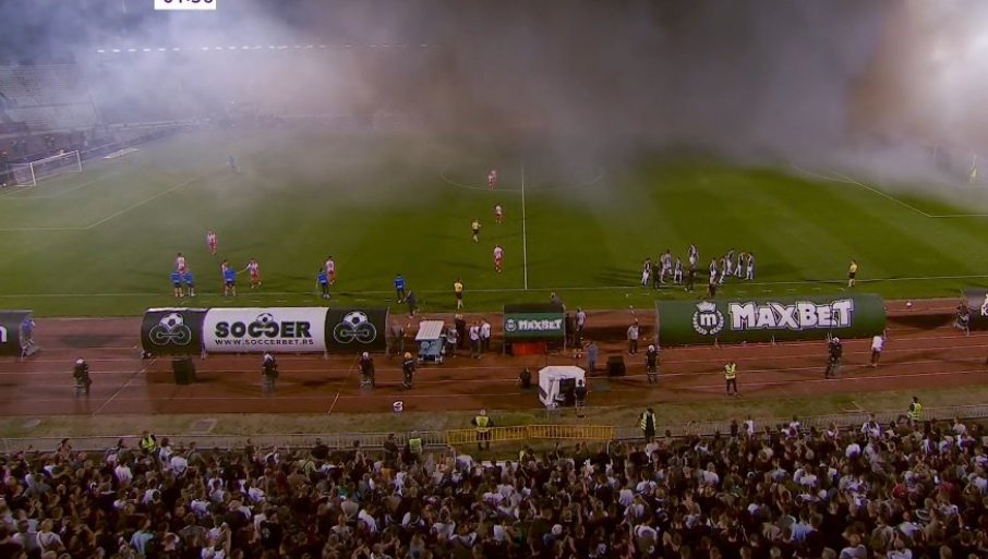 2' - Prekinut je derbi, jer se dim spustio na teren. Sudija je uzeo loptu i, zajedno sa igračima, ide ka aut-liniji.